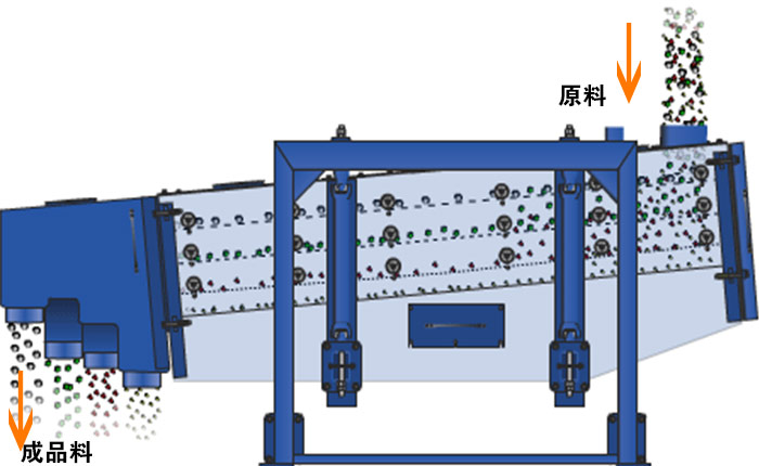 從篩機搖動體即篩箱運動軌跡來看 ,方型,其驅(qū)動裝置所產(chǎn)生的振動力是一繞定軸、方向呈一定規(guī)律變化的慣性力,其本質(zhì)是由偏心輪繞定軸轉(zhuǎn)動所形成的往復(fù)慣性力。根據(jù)搖擺篩的結(jié)構(gòu)特點及工作原理, 其篩面一般為水平或微傾斜布置(傾斜角度為0°~5°)。回旋篩的工作原理為,篩機起動后,篩機搖動體即篩箱在慣性力的作用下作前后往復(fù)運動,篩箱帶動篩面作周期性搖動,從而使篩面上的物料隨篩箱一同作平面回旋式運動,其間,小于篩面孔徑的物料通過篩孔落到下層,成為篩下物,大于篩面孔徑的物料經(jīng)連續(xù)翻滾跳躍運動后從排料口排出, 完成篩分工作。