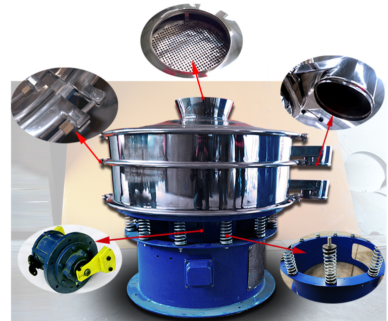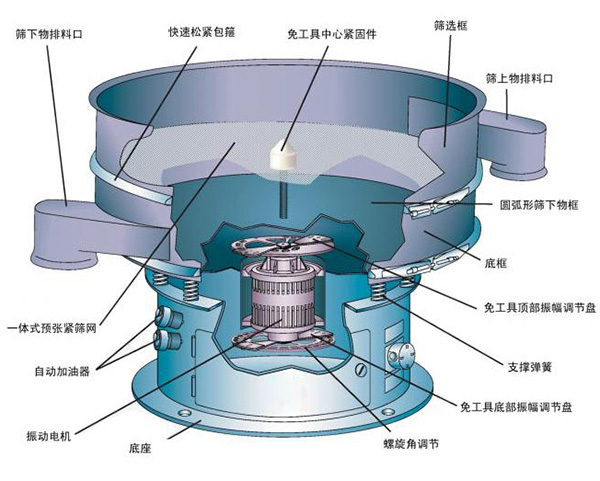 旋振篩是一種高精度細(xì)粒篩分設(shè)備,我公司在吸收國(guó)內(nèi)外先進(jìn)技術(shù)基礎(chǔ)上,設(shè)計(jì)出具有國(guó)內(nèi)先進(jìn)水平的機(jī)型,高篩分500目。本機(jī)通過振動(dòng)電機(jī)的上下激振力使其做三次元運(yùn)動(dòng),迫使物料成螺旋跳躍前進(jìn),終由出料口排出。該設(shè)備是由底座的普通電機(jī),通過橡膠聯(lián)軸器,帶動(dòng)激振器、激振器的上下兩端裝有偏心重錘,將電機(jī)的旋轉(zhuǎn)運(yùn)動(dòng)變?yōu)榇怪?、水平、傾斜的三次元運(yùn)動(dòng),再把運(yùn)動(dòng)傳遞給篩面,調(diào)節(jié)上下兩端偏心重錘的相位角來改變物料在篩面上的運(yùn)動(dòng)軌跡。