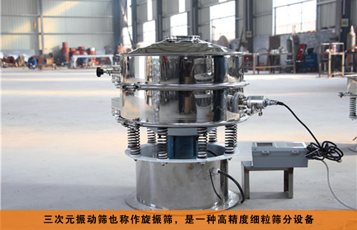 三次元振動篩也稱作旋振篩,是一種高精度細粒篩分設備。我公司在吸收國內(nèi)外先進技術基礎上,設計出具有國內(nèi)先進水平的機型,高篩分500目。本機通過振動電機的上下激振力使其做三次元運動,迫使物料成螺旋跳躍前進,終由出料口排出。該設備由立式電機作為激振源,電機上下兩端安裝有偏心重錘,將電機的旋轉運動變?yōu)榇怪薄⑺?、傾斜的三次元運動,再把運動傳遞給篩面,調(diào)節(jié)上下兩端偏心重錘的相位角,可以改變物料在篩面上的運動軌跡。