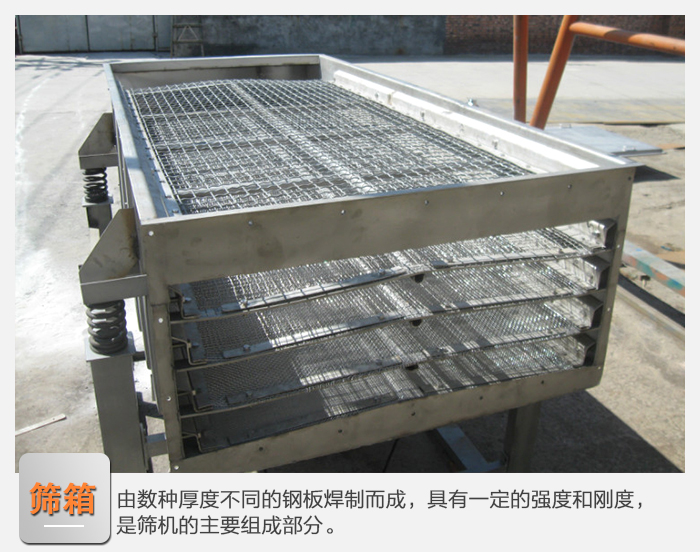 1、篩箱:由數(shù)種厚度不同的鋼板焊制而成,具有一定的強(qiáng)度和剛度,是篩機(jī)的主要組成部分。