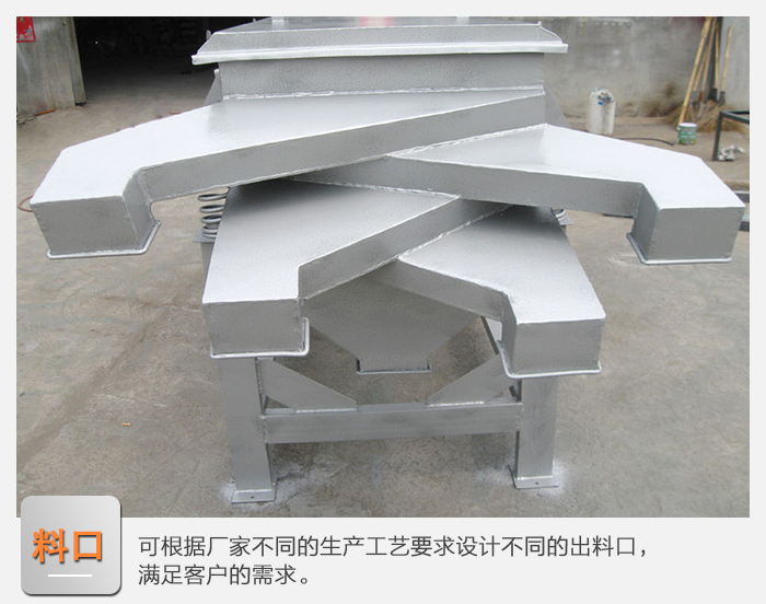 3、進(jìn)料口:進(jìn)料口分為兩種,一種為常規(guī)進(jìn)料口,另一種為帶布料器的進(jìn)料口(可使物料快速分布在篩網(wǎng)的整個(gè)斷面上,篩分更有效)。