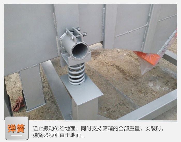 8、減振彈簧:阻止振動(dòng)傳給地面,同時(shí)支持篩箱的全部重量,安裝時(shí),彈簧必須垂直于地面。