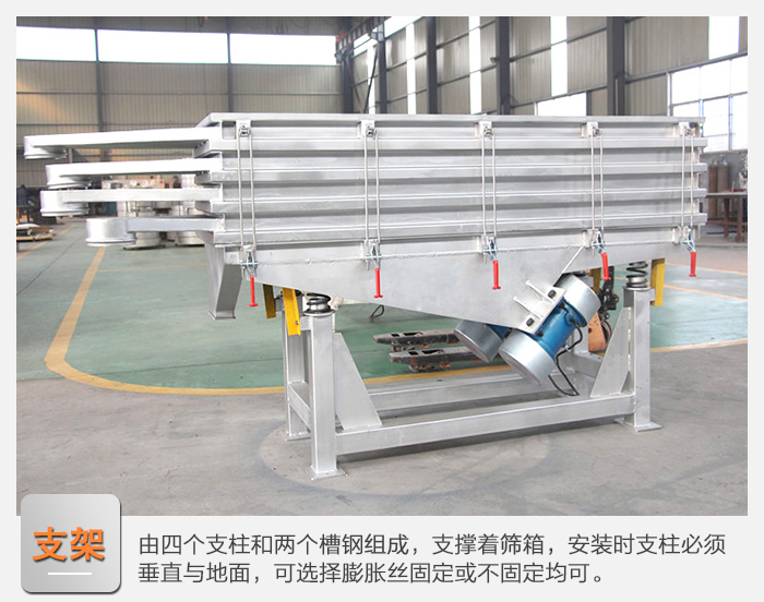 9、支架:由四個(gè)支柱和兩個(gè)槽鋼組成,支撐著篩箱,安裝時(shí)支柱必須垂直與地面,兩支柱下面的槽鋼應(yīng)相互平行,可選擇膨脹絲固定或不固定均可。