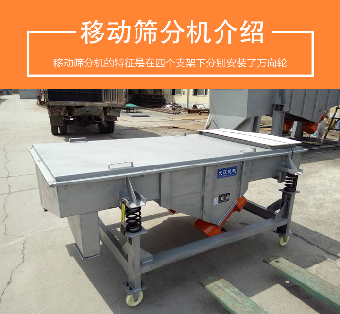 移動篩分機的主要特征是在篩分機四個支架下分別安裝了,萬向輪便于篩分機的移動。所以被稱之為移動篩分機。