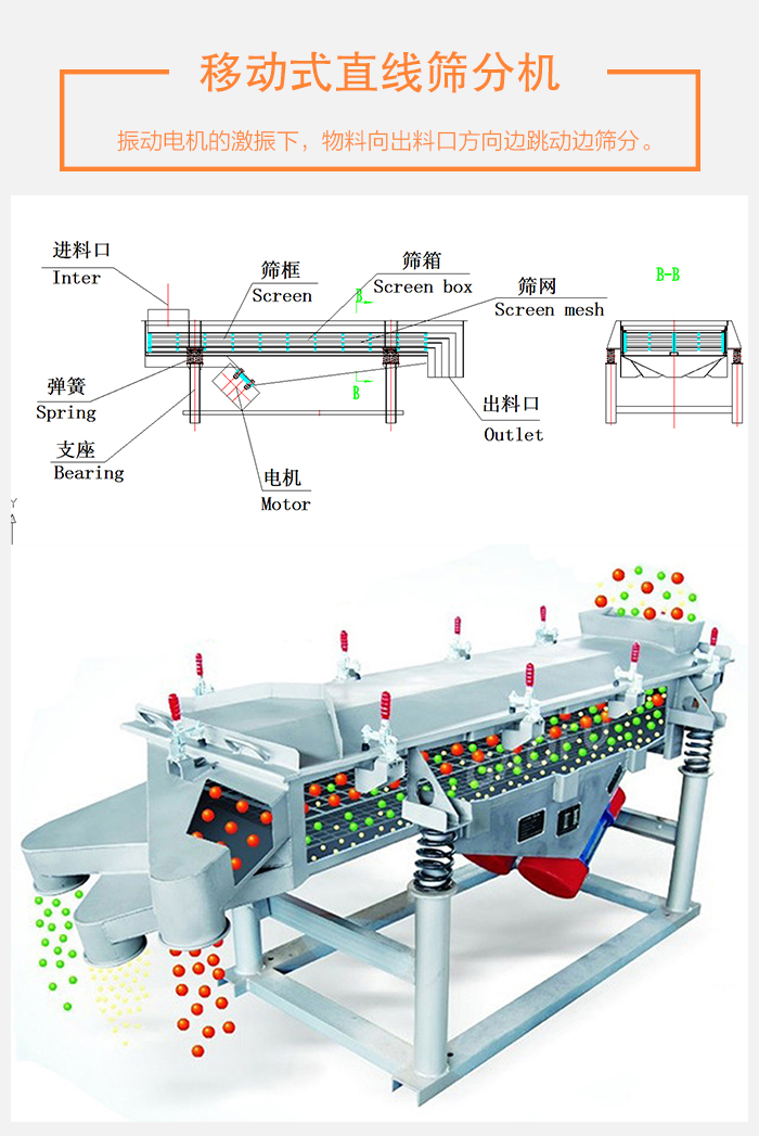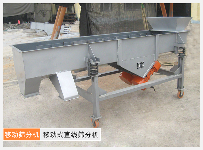 移動式直線篩分機物料從給料機均勻地進(jìn)入篩分機的進(jìn)料口,在振動電機的激振下,向出料口方向邊跳動邊篩分,通過多層篩網(wǎng)篩分出數(shù)種產(chǎn)品和不合格的篩上、篩下物,分別從各自的出口排出,流入料倉或盛料筒。