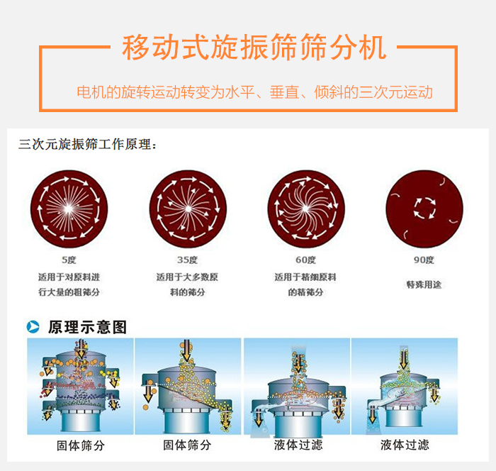 移動式旋振篩篩分機由直立式振動電機作為激振源,電機上、下兩端安裝有偏心重錘,將電機的旋轉(zhuǎn)運動轉(zhuǎn)變?yōu)樗?、垂直、傾斜的三次元運動,再把這個運動傳遞給篩面進(jìn)行篩分。調(diào)節(jié)上、下兩端的相位角,可以改變物料在篩面上的運動軌跡。通過改變振動電機的上下2塊偏心塊的夾角和質(zhì)量,振動電機即可帶動設(shè)備產(chǎn)生不同大小的振動力,從而改變水平或垂直方向的振動幅度,進(jìn)而改變篩分的流量和效率。